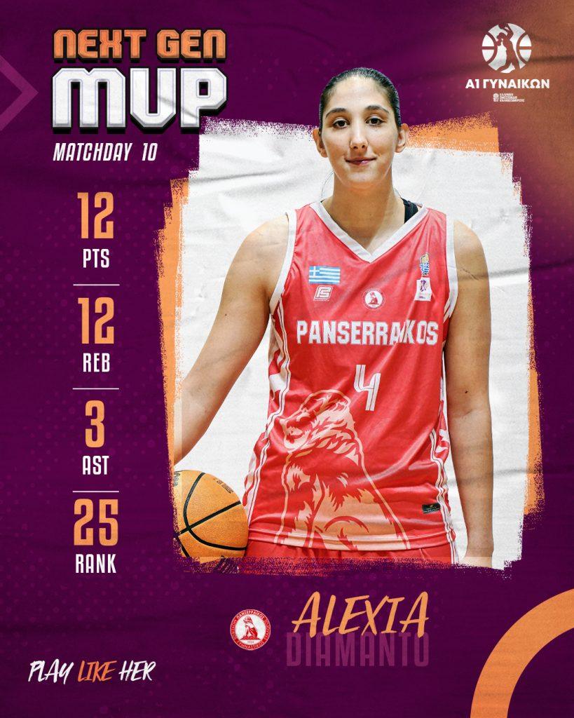Η Διαμάντω Αλεξιά του Πανσερραϊκού κερδίζει για τρίτη φορά τη φετινή αγωνιστική περίοδο τη διάκριση της MVP Next Gen. Στην νίκη της ομάδας της με 80-51 απέναντι στην Ανόρθωση Βόλου είχε 12 πόντους, 12 ριμπάουντ, 3 ασίστ, ένα κλέψιμο, 2 τάπες και 25 στο σύστημα αξιολόγησης μετά από 21’28” συμμετοχής.