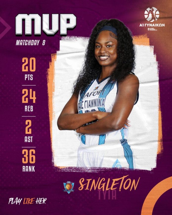 Η Αμάνι Σίγκλετον στην νίκη του ΠΑΣ Γιάννινα με 73-61 επί του Παναθλητικού είχε 20 πόντους, 24 ριμπάουντ, 2 ασίστ, μία τάπα και συγκέντρωσε 36 στο σύστημα αξιολόγησης μετά από 36’37’’ συμμετοχής.
