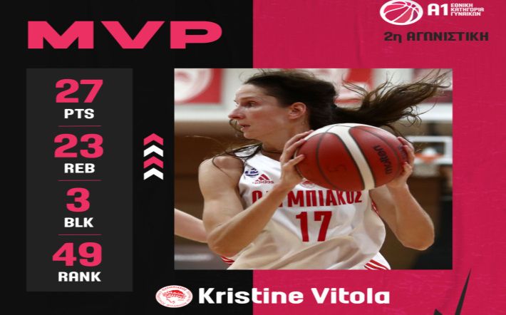 Επίδοση που χάρισε στην Κριστίν Βίτολα και τον τίτλο της πιο πολύτιμης παίκτριας για την 2η αγωνιστική στην A1 Γυναικών όπου ο Ολυμπιακός επικράτησε του Ηρακλή με 91-77.
