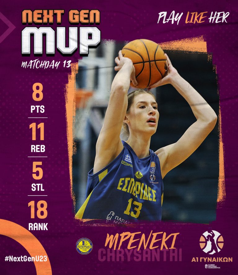 Σπουδαίας σημασίας νίκη σημείωσαν οι Εσπερίδες Καλλιθέας στη Θεσσαλονίκη επικρατώντας με 78-73 στην παράταση του Ηρακλή STIHL με την Χρυσάνθη Μπενέκη να ξεχωρίζει και να αναδεικνύεται MVP Next Gen της 13ης Αγωνιστικής. Η αρχηγός των Εσπερίδων είχε 8 πόντους, 11 ριμπάουντ, 3 ασίστ, 5 κλεψίματα, μία τάπα και 18 στο σύστημα αξιολόγησης μετά από 34’34’’λεπτά συμμετοχής.