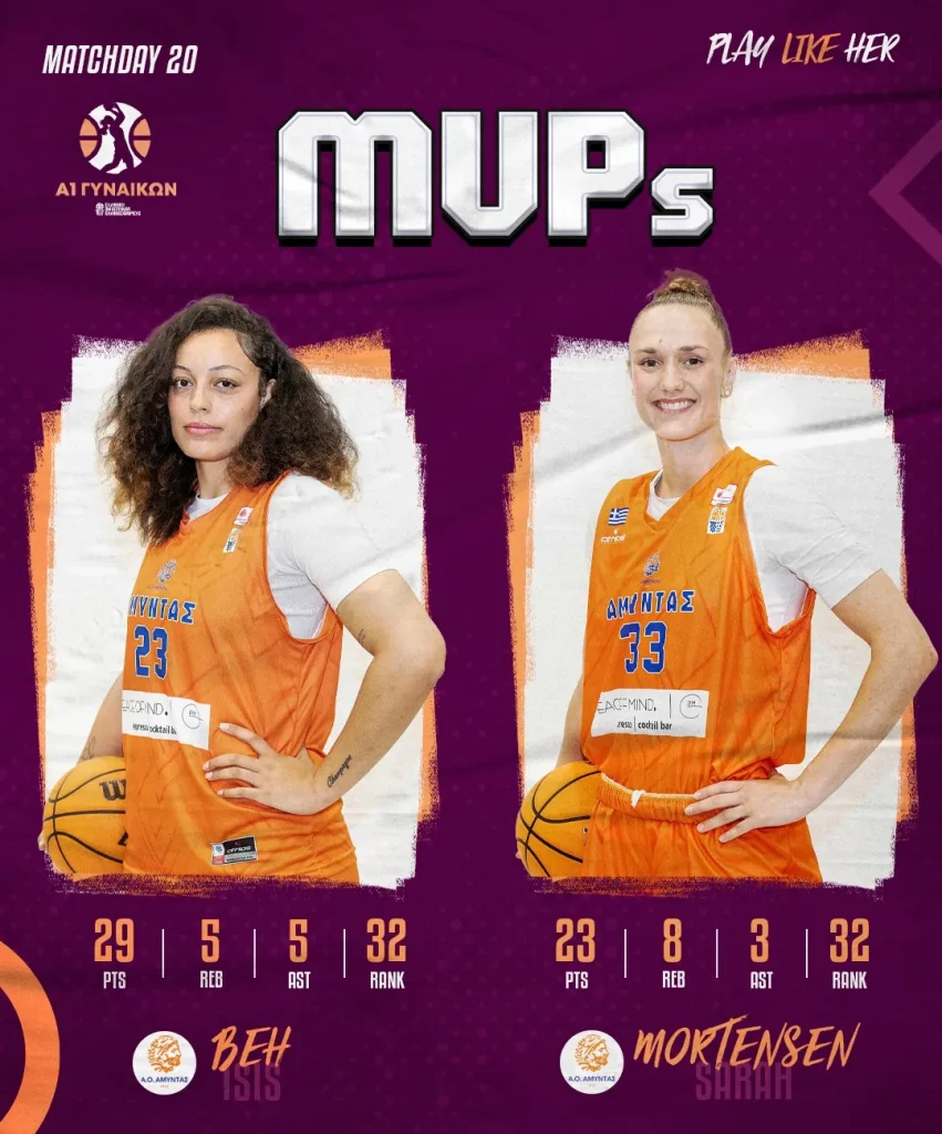Δύο αθλήτριες από την ίδια ομάδα, η Αϊσις Μπέι και η Σάρα Μόρτενσεν του Αμύντα μοιράζονται τον τίτλο της MVP της 20ης Αγωνιστικής στο πρωτάθλημα της Α1 Γυναικών.