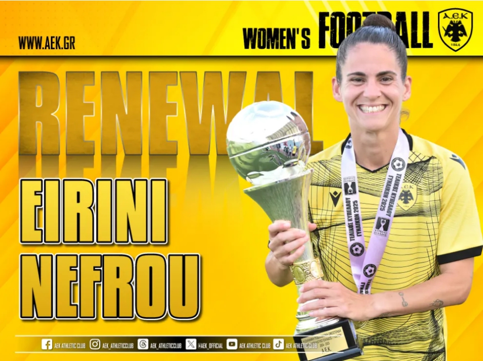 Η ΑΕΚ βρίσκεται στην ευχάριστη θέση να ανακοινώσει την ανανέωση της συνεργασίας της με την Ειρήνη Νεφρού. Η 31χρονη (13/05/1994) αμυντικός υπέγραψε το νέο της συμβόλαιο και θα παραμείνει στο δυναμικό της Γυναικείας ομάδας Ποδοσφαίρου του Συλλόγου και για την επόμενη σεζόν!