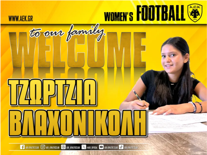 Η ΑΕΚ ανακοίνωσε την έναρξη της συνεργασίας της με την Τζώρτζια Βλαχονικολή. Η 16χρονη μεσοεπιθετικός υπέγραψε τετραετές συμβόλαιο και εντάσσεται στο δυναμικό της γυναικείας ομάδας Ποδοσφαίρου.