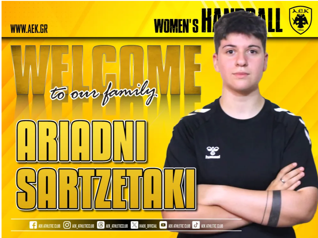 Η ΑΕΚ βρίσκεται στην ευχάριστη θέση να ανακοινώσει την έναρξη της συνεργασίας της με την Αριάδνη Σαρτζετάκη. Η 18χρονη (15/05/2007) τερματοφύλακας υπέγραψε το συμβόλαιό της και εντάσσεται στο δυναμικό της γυναικείας ομάδας Χάντμπολ.