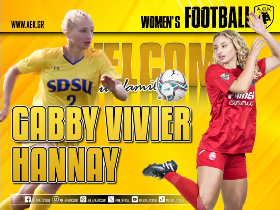 Η ΑΕΚ βρίσκεται στην πολύ ευχάριστη θέση να ανακοινώσει την έναρξη της συνεργασίας της με την Γκαμπριέλ (Γκάμπι) Βιβιέ-Χάνεϊ. Η διεθνής 26χρονη (28/07/1998) αθλήτρια, που αγωνίζεται, τόσο ως κεντρικός αμυντικός, όσο και ως αμυντικό χαφ, υπέγραψε και θα ενισχύσει το τμήμα του Ποδοσφαίρου Γυναικών της ΑΕΚ.