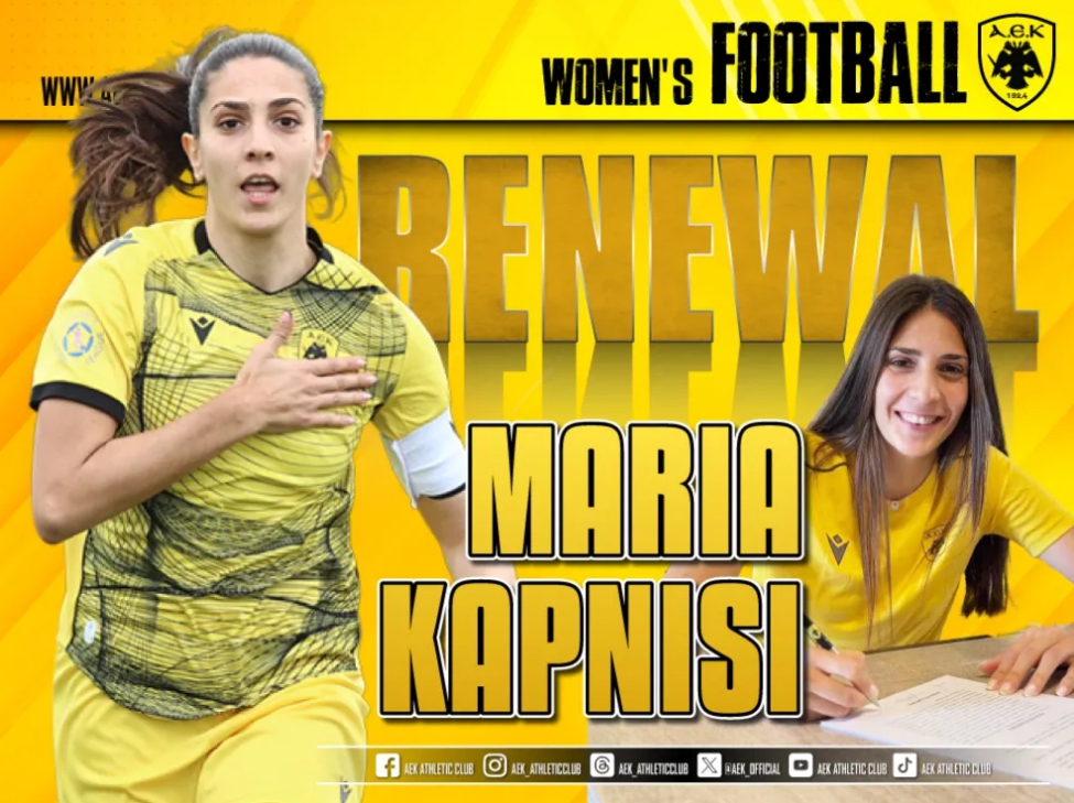 Η ΑΕΚ βρίσκεται στην πολύ ευχάριστη θέση να ανακοινώσει την ανανέωση της συνεργασίας της με την Μαρία Καπνίση. Η 26χρονη (03/06/1999) αρχηγός μας, υπέγραψε το νέο της συμβόλαιο και θα παραμείνει στο δυναμικό της γυναικείας ομάδας Ποδοσφαίρου και για τα επόμενα 2 χρόνια!