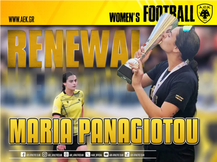 Η ΑΕΚ βρίσκεται στην ευχάριστη θέση να ανακοινώσει την ανανέωση της συνεργασίας της με την Μαρία Παναγιώτου. Η 20χρονη (05/02/2005) διεθνής Κύπρια μέσος, θα ενισχύσει και τη νέα σεζόν το τμήμα Ποδοσφαίρου Γυναικών της ΑΕΚ.