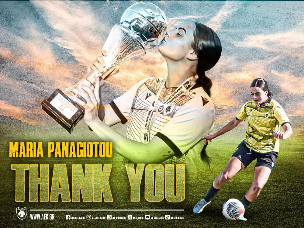 Η ΑΕΚ, ανακοίνωσε την κοινή συναινέσει λύση της συνεργασίας με την ποδοσφαιρίστρια, Μαρία Παναγιώτου. Η διεθνής Κύπρια κεντρική μέσος ήρθε στην ΑΕΚ το καλοκαίρι του 2024 και βοήθησε τα μέγιστα για την κατάκτηση του Νταμπλ. Η αποχώρηση της ξάφνιασε τον κόσμο της ΑΕΚ όπως φάνηκε από τις αντιδράσεις στα social media οταν έγινε γνωστή η αποχώρηση της. Πάντως η Παναγιώτου δεν βρισκόταν στα βασικά πλάνα του τεχνικού της ΑΕΚ
