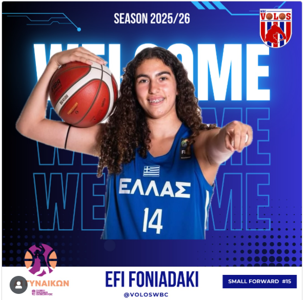 Η Διοίκηση του Βόλου ανακοινώνει την έναρξη συνεργασίας με τη διεθνή Έφη Φωνιαδάκη! Η Έφη είναι γεννημένη το 2008, έχει ύψος 1,80μ. και αγωνίζεται στη θέση του Small Forward, φέρνοντας στην ομάδα μας ενέργεια, ταλέντο και αγωνιστική ωριμότητα, παρά το νεαρό της ηλικίας.