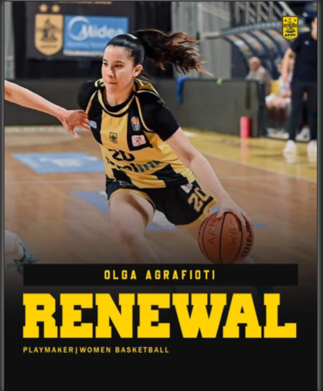 Ο Α.Σ. ΑΡΗΣ και το τμήμα Μπάσκετ Γυναικών ανακοινώνουν την ανανέωση της συνεργασίας με την Όλγα Αγραφιώτη. Η Όλγα Αγραφιώτη γεννήυθηκε στις 24 Φεβρουαρίου του 2006 και με ύψος 1.66, αγωνίζεται στη θέση της σούτινγκ γκαρντ. Ξεκίνησε την μπασκετική σταδιοδρομία της στον Ατρόμητο Πειραιά και στη συνέχεια αγωνίστηκε στις Εσπερίδες Καλλιθέας. Έως τη σεζόν 2023-24 ήταν αθλήτρια του Ολυμπιακού και από πέρυσι αγωνίζεται στον ΑΡΗ.