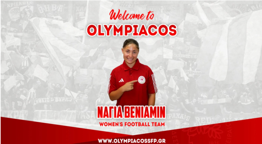 Ο ΟΛΥΜΠΙΑΚΟΣ Σ.Φ.Π. ανακοινώνει την έναρξη της συνεργασίας του με τη Νάγια Βενιαμίν. Η 20χρονη (ημ. γέννησης 21/07/2005) επιθετικός, διεθνής με την Εθνική Νεανίδων και Κορασίδων, υπέγραψε το συμβόλαιό της και εντάσσεται στο ρόστερ της ομάδας ποδοσφαίρου Γυναικών του συλλόγου.