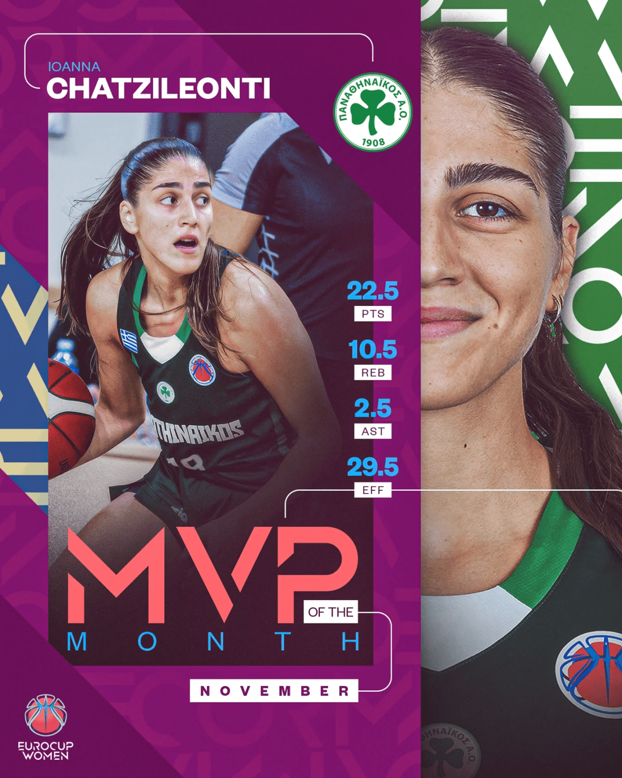 Μια σημαντική διάκριση κέρδισε διεθνής Ελληνίδα αθλήτρια στο EuroCup Γυναικών, καθώς η Ιωάννα Χατζηλεοντή αναδείχθηκε πολυτιμότερη παίκτρια για τον μήνα Νοέμβριο στη διοργάνωση, χάρη στις εμφανίσεις της με την φανέλα του Παναθηναϊκού σε αυτό το χρονικό διάστημα.