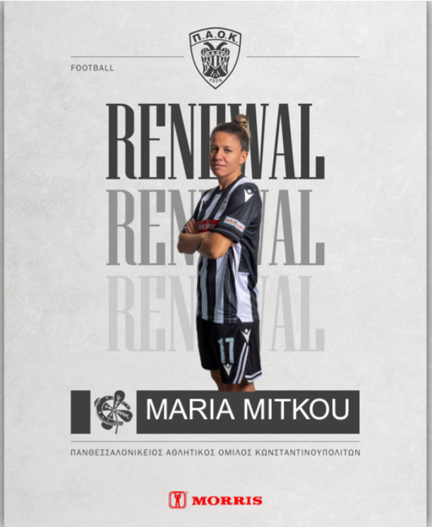 Ο ΠΑΟΚ, και το τμήμα Ποδοσφαίρου γυναικών, ΠΑΟΚ Morris, ανακοινώνουν την ανανέωση συνεργασίας με την αθλήτρια, Μαρία Μήτκου, για την αγωνιστική περίοδο 2025-2026.