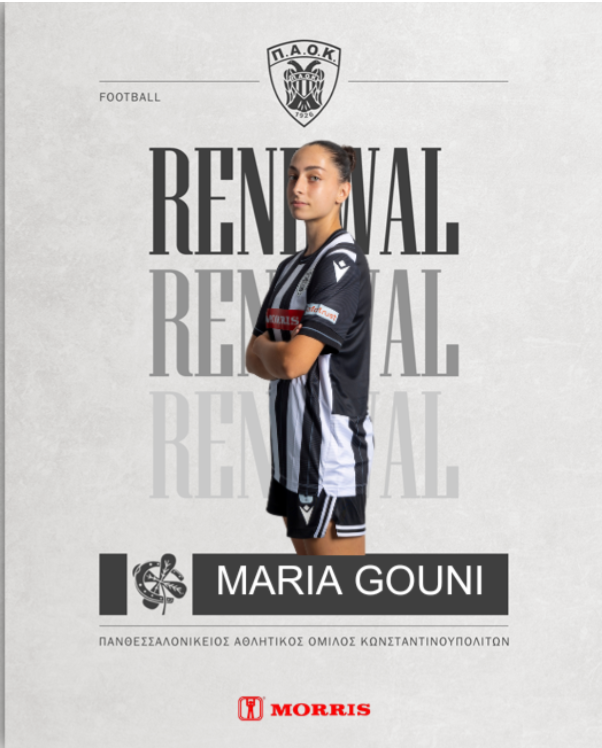 Ο ΠΑΟΚ, και το τμήμα Ποδοσφαίρου γυναικών, ΠΑΟΚ Morris, ανακοινώνουν την ανανέωση συνεργασίας με την αθλήτρια, Μαρία Γκούνη, για την αγωνιστική περίοδο 2025-2026.