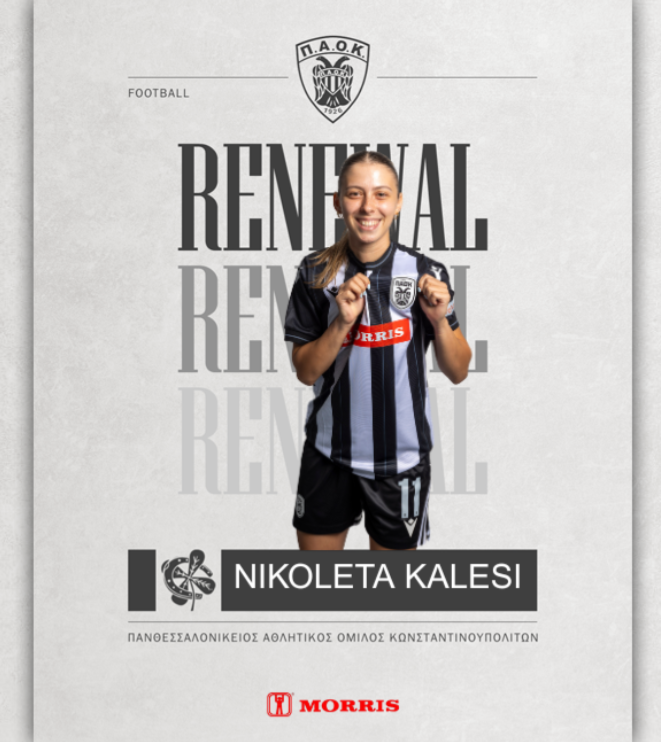 Ο ΠΑΟΚ και το τμήμα Ποδοσφαίρου γυναικών, ΠΑΟΚ Morris, ανακοινώνουν την ανανέωση συνεργασίας με την αθλήτρια, Νικολέτα Καλέση, για την αγωνιστική περίοδο 2025-2026.