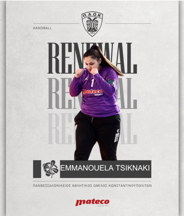 Ο ΠΑΟΚ, και το τμήμα Χάντμπολ γυναικών, ΠΑΟΚ mαteco, ανακοινώνουν την ανανέωση συνεργασίας με την αθλήτρια, Εμμανουέλα Τσικνάκη, για την αγωνιστική περίοδο 2025-2026.