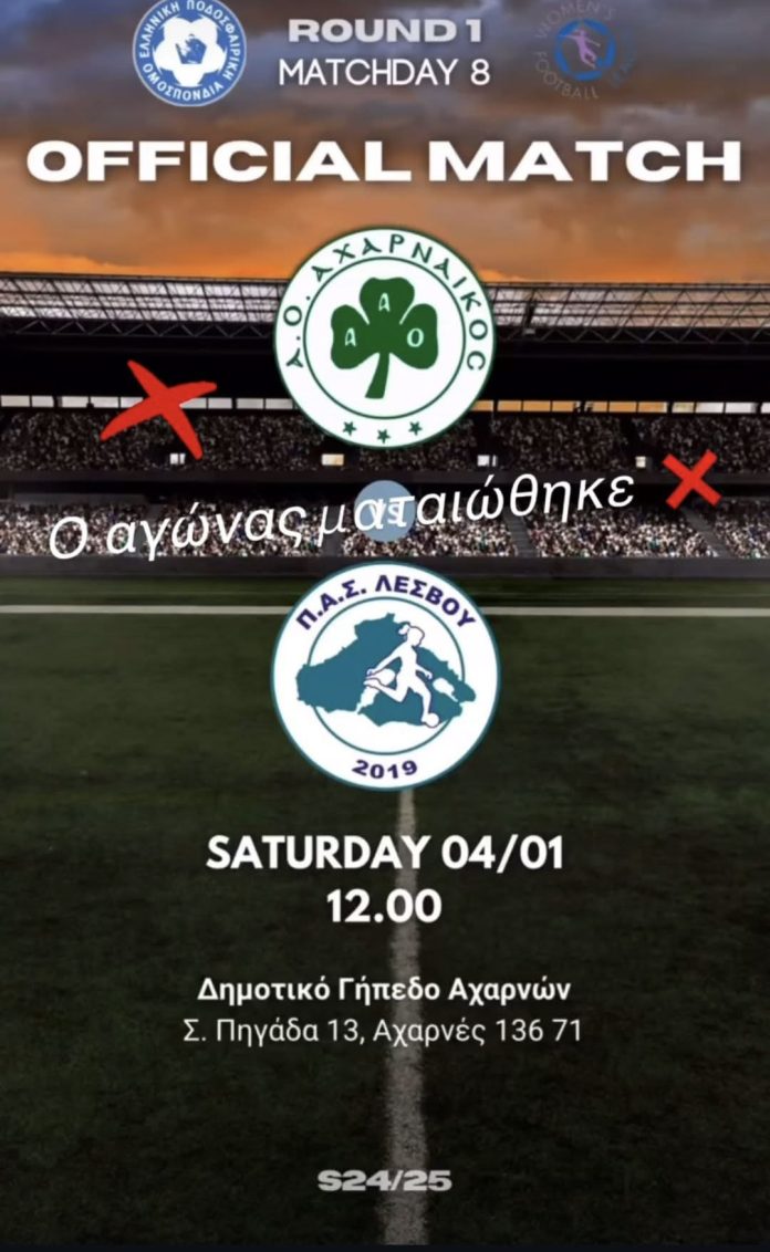 Αναβλήθηκε ο προγραμματισμένος για σήμερα, Σάββατο, 4/01, αγώνας μεταξύ του Αχαρναικου και του ΠΑΣ Λεσβου. Η ΕΠΟ θα ορίσει εκ νέου τον αγώνα μεταξύ των 2 ομάδων σε νεότερη ημερομηνία.