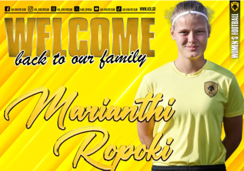 Η ΑΕΚ βρίσκεται στην ευχάριστη θέση να ανακοινώσει την έναρξη της συνεργασίας της με την Μαριάνθη Ροπόκη. Η Ανθή είναι γεννημένη στις 9 Ιανουαρίου του 2011 και επιστρέφει στο τμήμα του Ποδοσφαίρου Γυναικών του Συλλόγου.