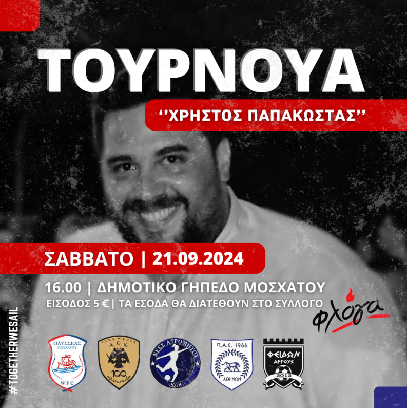 Με επιτυχία πραγματοποιηθηκε το 1ο Τουρνουά ποδοσφαίρου “ΧΡΗΣΤΟΣ ΠΑΠΑΚΩΣΤΑΣ” το Σάββατο 21/9/2024 στο Δημ. γήπεδο Μοσχάτου, το Τουρνουά μνήμης διοργάνωσε ο Οδυσσέας Μοσχάτου. Τα έσοδα θα διατεθούν στον σύλλογο “ΦΛΟΓΑ”. Το τουρνουά ποδοσφαίρου διοργανώθηκε στη μνήμη του Χρήστου Παπακώστα, γιος του Προέδρου της ομάδας του Μοσχάτου, Κώστα Παπακώστα, που έφυγε τόσο νωρίς και άδικα από τη ζωή. Στο τουρνουά συμμετείχαν οι ομάδες ΑΕΚ WFC, ΝΕΕΣ ΑΤΡΟΜΗΤΟΥ WFC, ΦΕΙΔΩΝ ΑΡΓΟΥΣ WFC, ΠΑΣ ΑΘΗΝΩΝ WFC και ΟΔΥΣΣΕΑΣ ΜΟΣΧΑΤΟΥ.