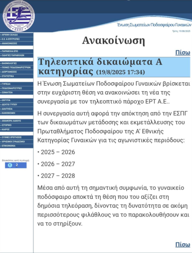 Σύμφωνα με την ανακοίνωση στην ΕΡΤ παραχωρήθηκαν τα δικαιώματα της τηλεοπτικής μετάδοσης αγώνων της Α Εθνικής, που τελεί υπό την αιγίδα της Ένωσης για τις σεζόν 2025-2026, 2026-2027, 2027-2028.