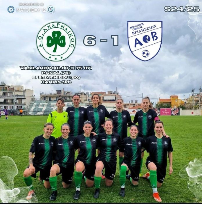 Εύκολο απόγευμα για την ομάδα του Αχαρναικού που συνέτριψε με σκορ 6-1 την ομάδα των Βριλησσίων στα πλαίσια της 10ης αγωνιστικής. Έτσι η ομάδα του Αχαρναικού μετράει 10 νίκες σε ισάριθμα παιχνίδια και δείχνει να μην έχει αντίπλαο στον 4ο όμιλο της Β εθνικής για την υπόθεση της ανόδου. Τα γκολ για την ομάδα του Γιώργου Μακρίδη σημειωσαν η Βασιλακοπούλου που πέτυχε χατ τρικ (3′, 75′, 87′), η Παβάλ (76′), η Ευσταθιάδου (80′) και η Χάρις (90′).