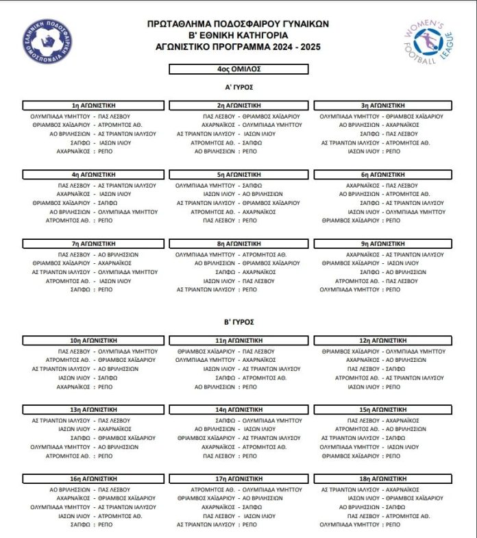 Το πρόγραμμα του 4ου ομίλου της Β΄ Εθνικής Γυναικών.