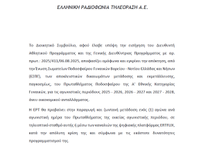 Το Διοικητικό Συμβούλιο, αφού έλαβε υπόψη την εισήγηση του Διευθυντή Αθλητικού Προγράμματος και της Γενικής Διευθύντριας Προγράμματος με αρ. πρωτ.: 2025/411/06.08.2025, αποφασίζει ομόφωνα και εγκρίνει την απόκτηση, από την Ένωση Σωματείων Ποδοσφαίρου Γυναικών Βορείου – Νοτίου Ελλάδας και Νήσων (ΕΣΠΓ), των αποκλειστικών δικαιωμάτων μετάδοσης και εκμετάλλευσης, παγκοσμίως, του Πρωταθλήματος Ποδοσφαίρου της Α’ Εθνικής Κατηγορίας Γυναικών, για τις αγωνιστικές περιόδους 2025 – 2026, 2026 – 2027 και 2027 – 2028, άνευ οικονομικού ανταλλάγματος.