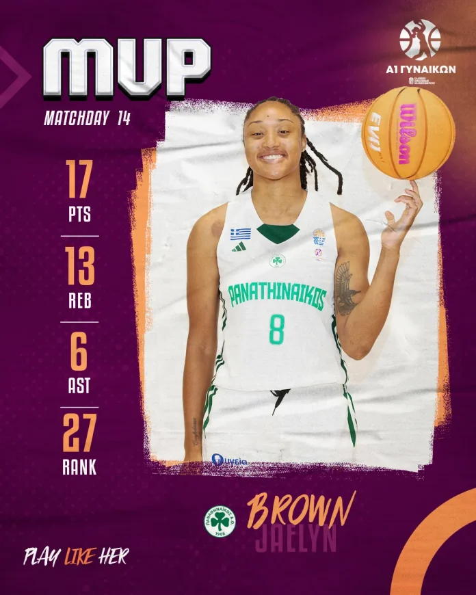 Η Τζάελιν Μπράουν του Παναθηναϊκού είναι η MVP της 14ης Αγωνιστικής. Η Μπράουν, η οποία είχε αναδειχθεί MVP και την 11η Αγωνιστική, στην νίκη του Παναθηναϊκού με 83-79 επί του Πρωτέα Βούλας είχε 17 πόντους, 13 ριμπάουντ, 6 ασίστ, ένα κλέψιμο, μια τάπα και 27 στο σύστημα αξιολόγησης μετά από 33’40΄΄συμμετοχής.