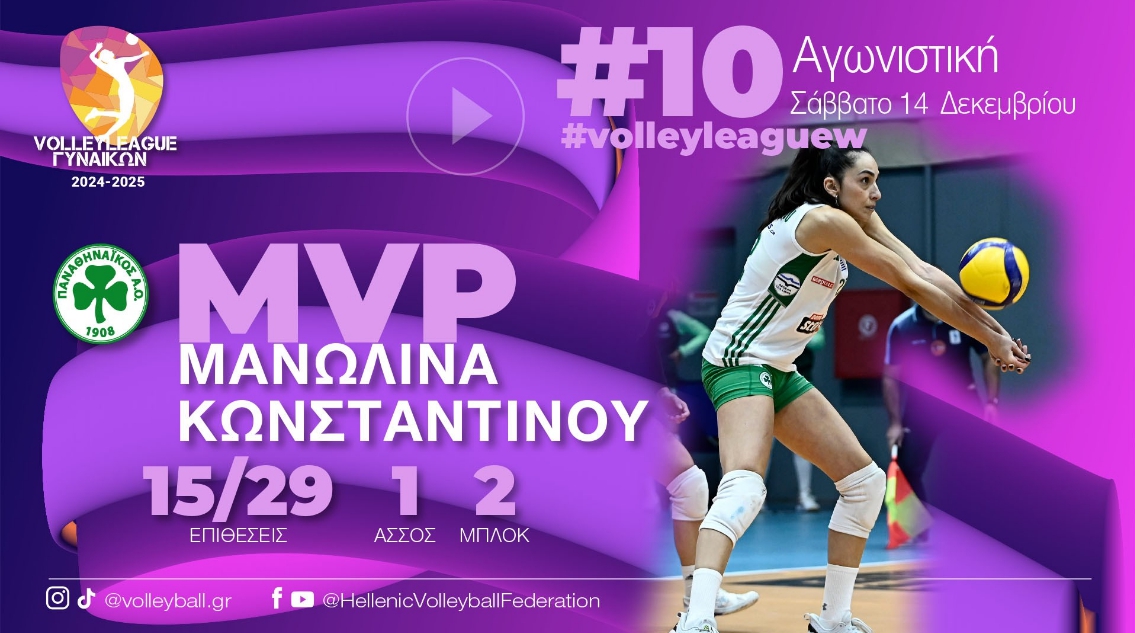 Η Μανωλίνα Κωνσταντίνου του Παναθηναϊκού είναι η MVP της 10ης αγωνιστικής στο πρωτάθλημα της Volley League γυναικών.