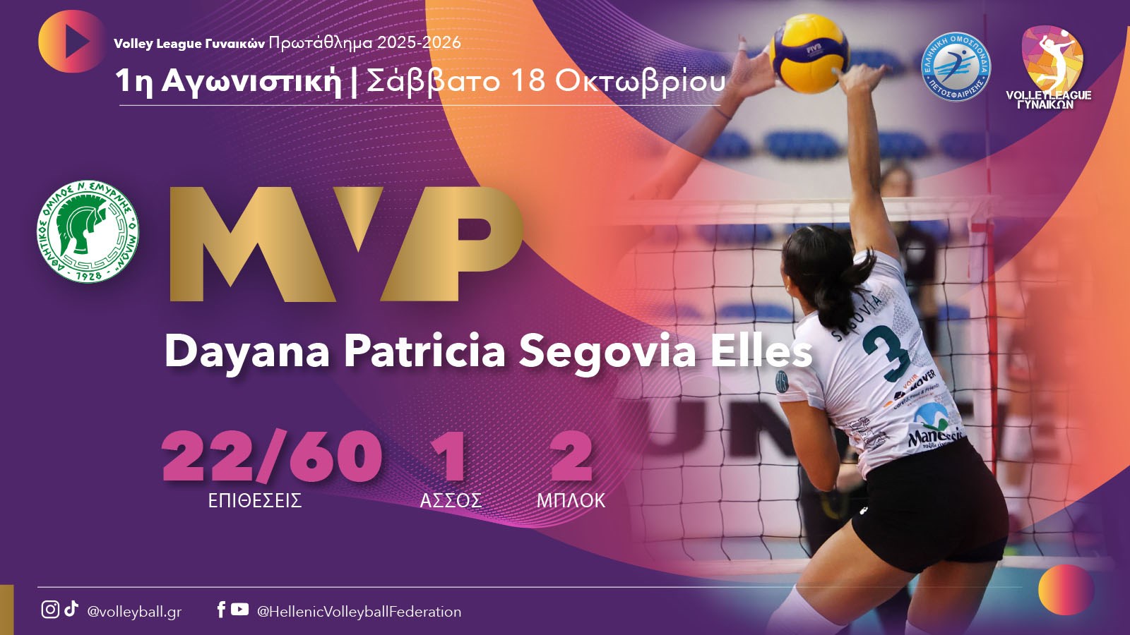 Η Νταϊάνα Σεγκόβια του Μίλωνα είναι η MVP της 1ης αγωνιστικής του πρωταθλήματος της Volley League Γυναικών 2025-2026.